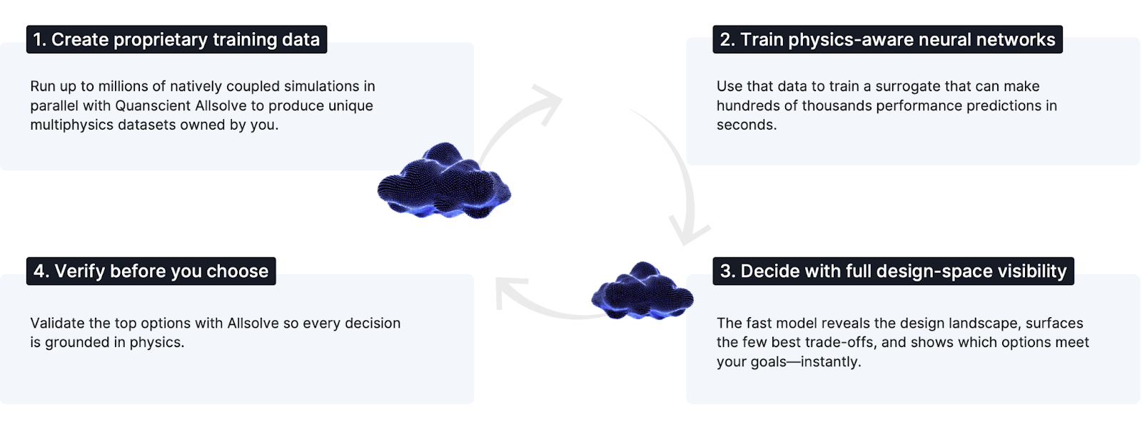 Quanscient’s Allsolve generates large simulation datasets - often tens of thousands of samples - in hours rather than weeks, thanks to scalable cloud compute. Then, neural-network surrogate models learn the relationships between inputs (geometry, material properties, operating conditions) and outputs (KPIs, fields, spectra).