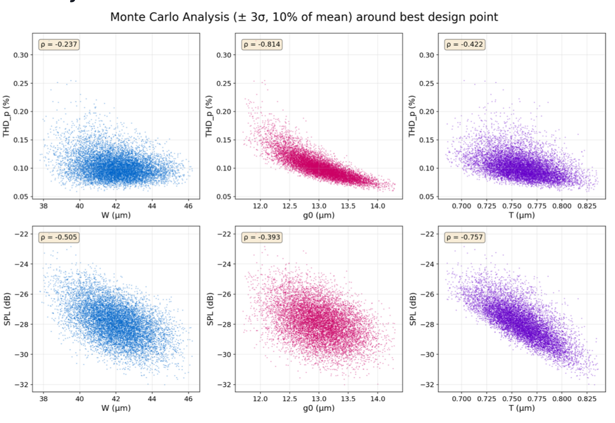 The visualizations below show how the surrogate model predicts performance variation under realistic manufacturing tolerances, revealing how SPL and THD shift across thousands of randomized design samples.