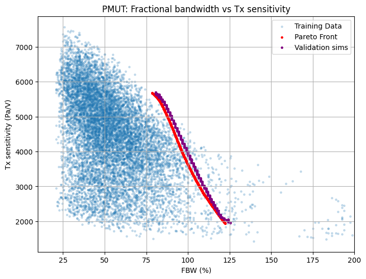 The chart below visualizes the PMUT design space and the AI-generated Pareto front.